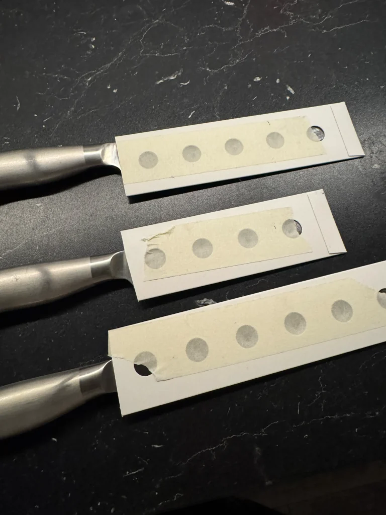 Dessa kommer vi även sälja till andra som slipar, de mäter 310*50mm så de flesta knivar passar och hålen är designade att fungera som fästpunkt med tejp, ha er egen tejp med tryck på för att göra reklam för ert sliperi eller vanlig enkel maskeringstejp. De är gjorda i kartong lite tjockare än mjölkkartong och blir därför mycket stadiga och robusta.